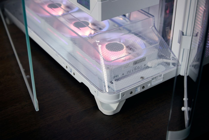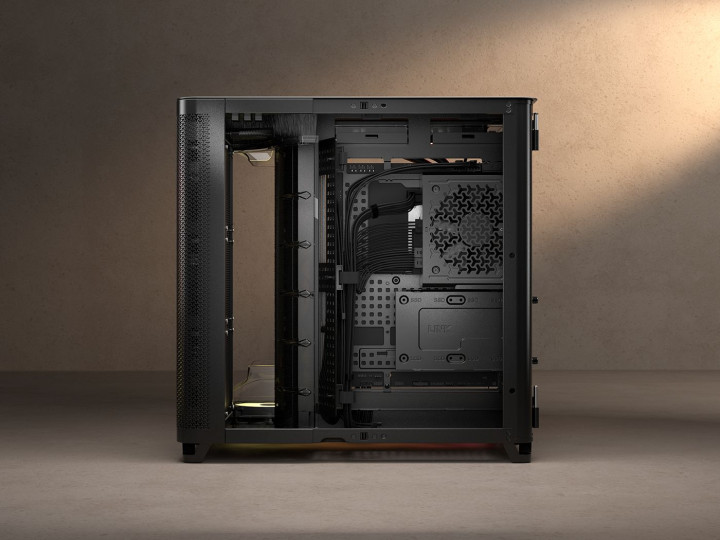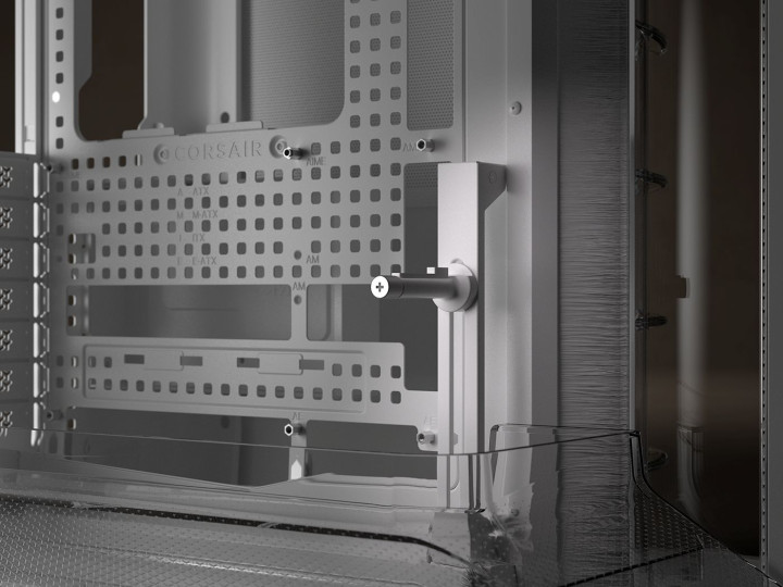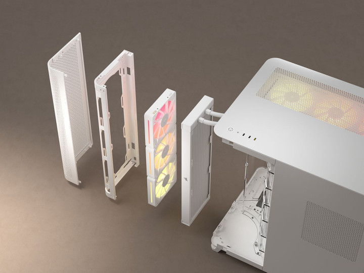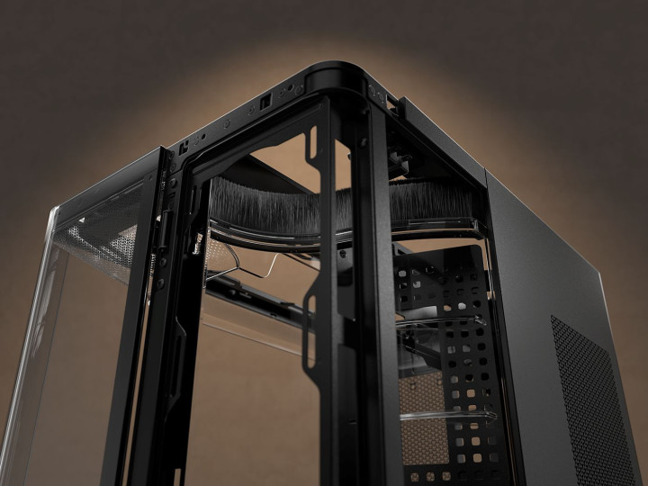 该机箱采用无柱海景房设计,前左两侧采用双曲面玻璃法式门面板,主腔上下各有一组导风气流管道,右前腔也包含侧出风导流结构。其兼容背插主板,配备方便理线的RapidRoute2.0穿孔板式主板托盘,内置GPU防垂稳定臂。