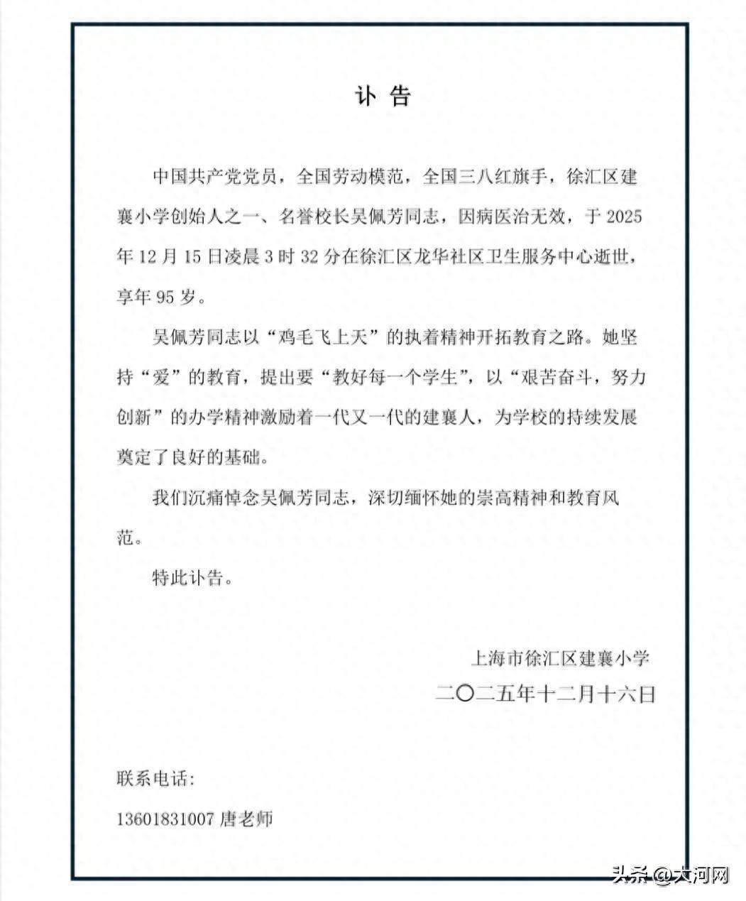 12月16日,“徐汇区建襄小学”微信公众号发布讣告:中国共产党党员,全国劳动模范,全国三八红旗手,上海徐汇区建襄小学创始人之一、名誉校长吴佩芳同志,因病医治无效,于2025年12月15日凌晨3时32分在徐汇区龙华社区卫生服务中心逝世,享年95岁。